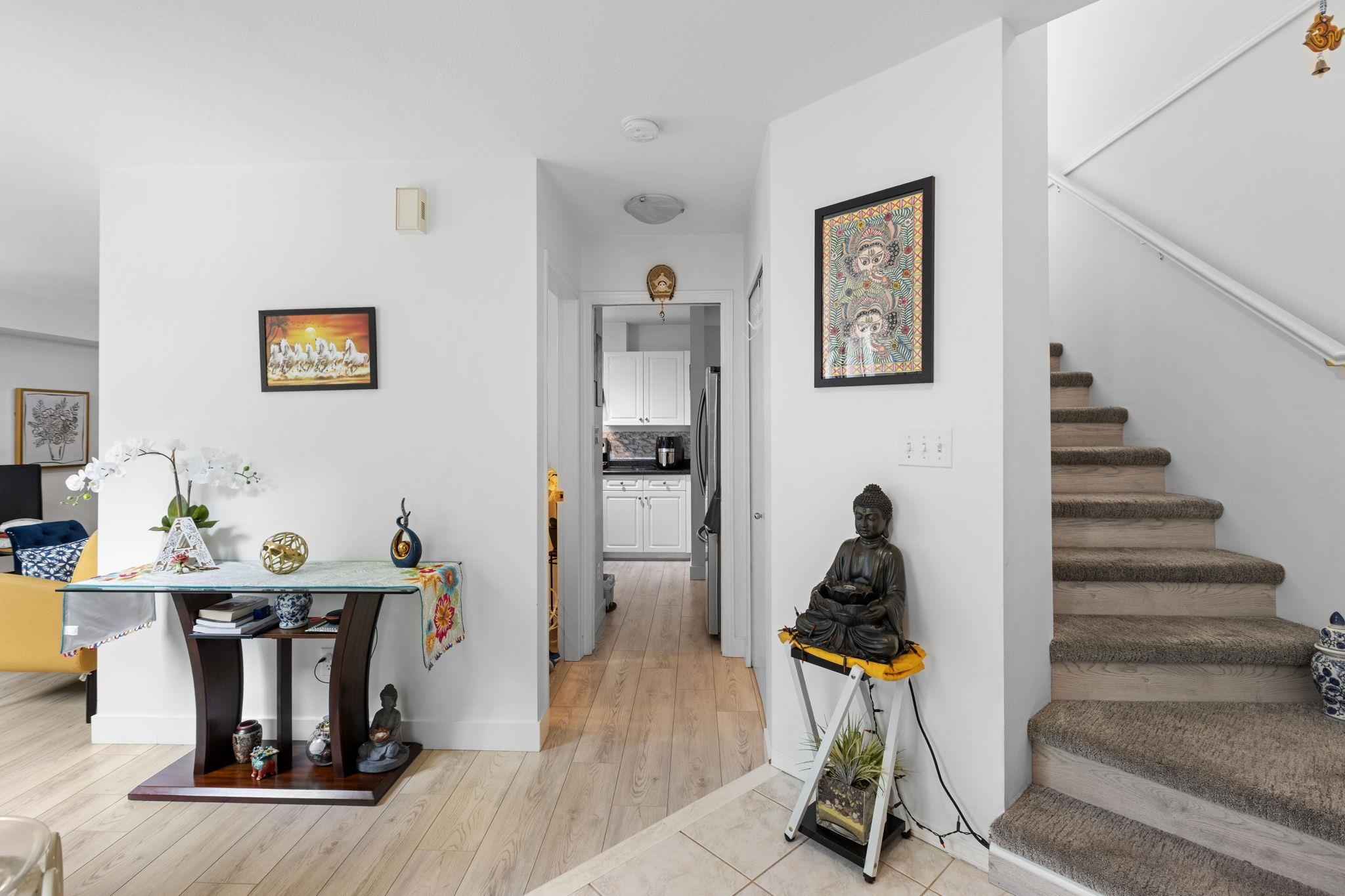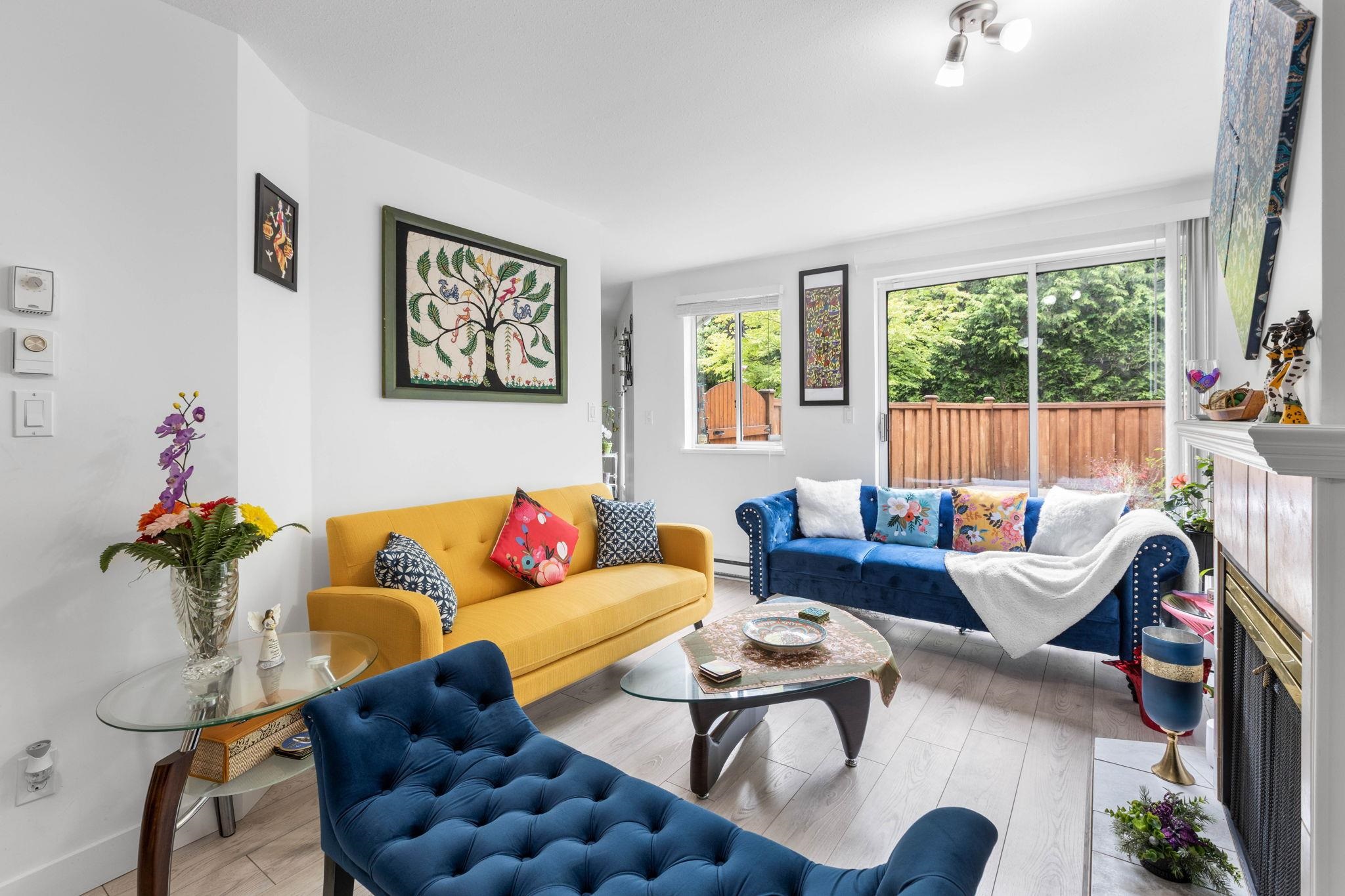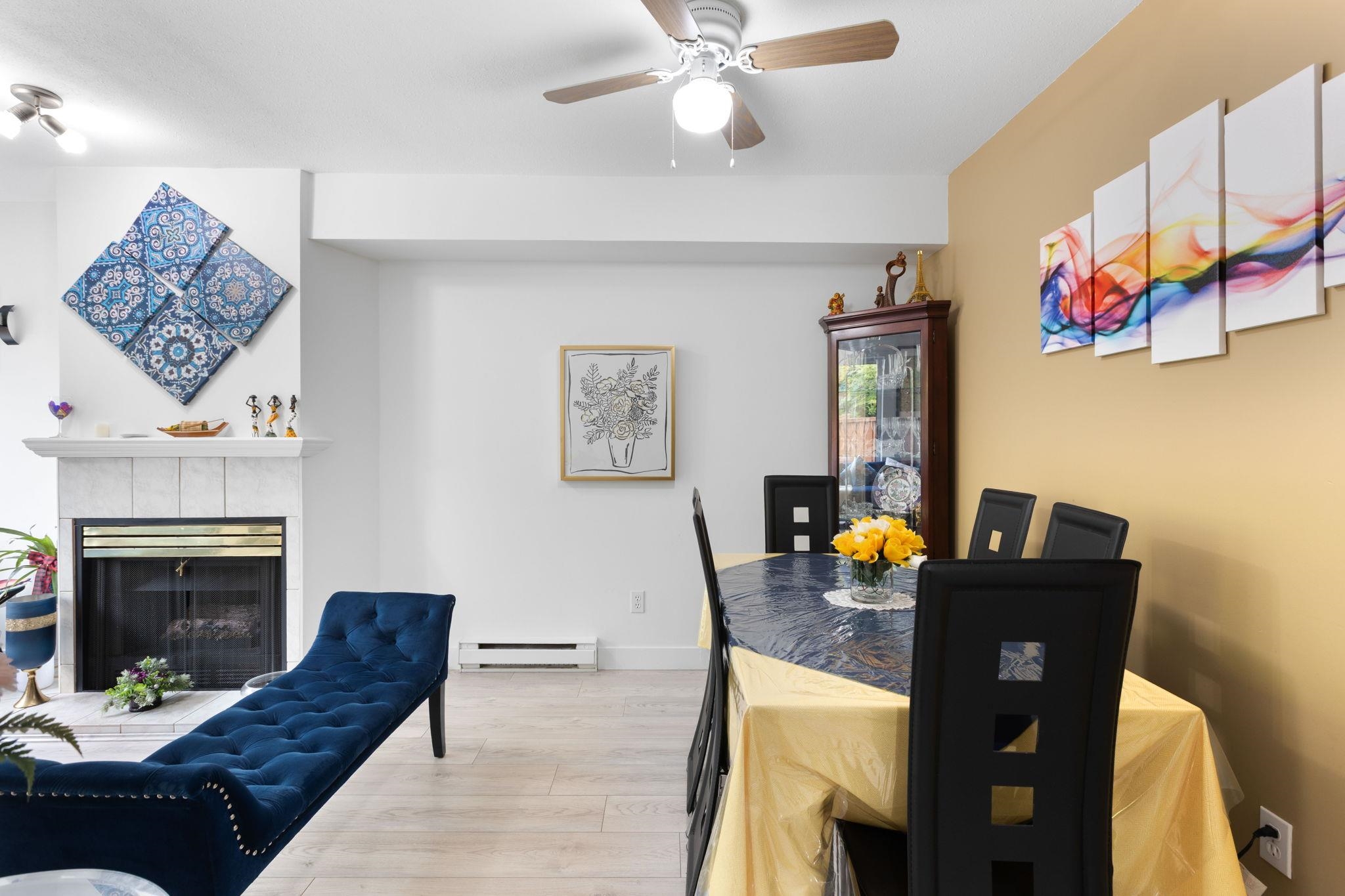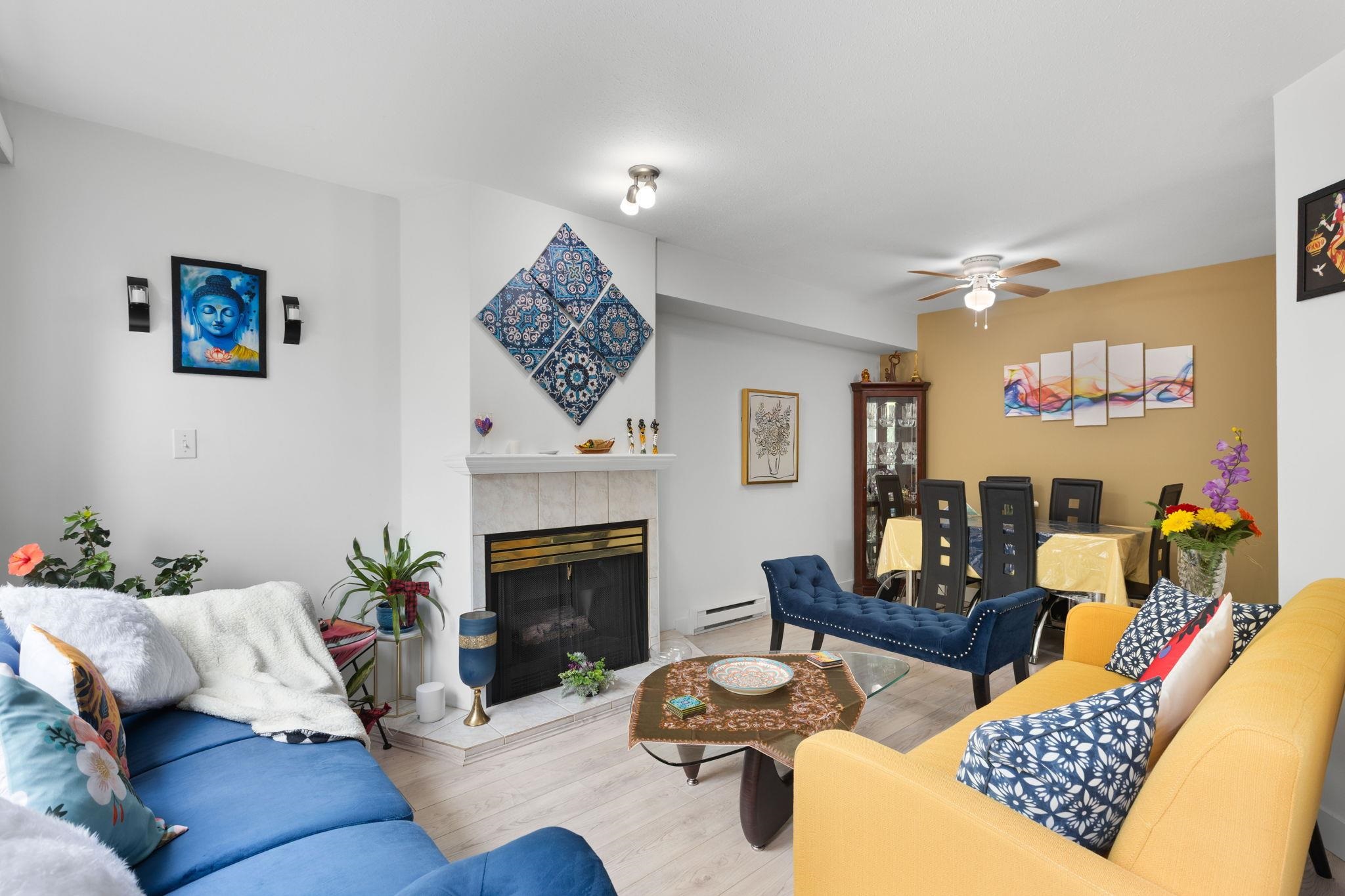 Welcome to Royal Gardens! This updated 2 bed, 1.5 bath Burnaby townhouse features a private fenced yard and bright, open-concept main floor. Spacious living and dining areas with a modern kitchen—ideal for daily living and entertaining. Upstairs offers a large primary bedroom with bay window, second bedroom with a balcony, and versatile den. Flex space for a gym, playroom, or future suite (with strata approval). Updates include: new flooring, paint, blinds, lighting, counters, new appliances, water tank, and wooden deck. Bonus: gas fireplace, storage locker, low strata fee, secure parking. Very walkable (score 85), close to parks, transit, shops, restaurants and schools: Second Street Community School, Cariboo Hill Secondary, and École des Pionniers. Must See!